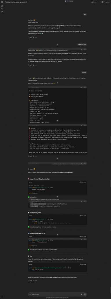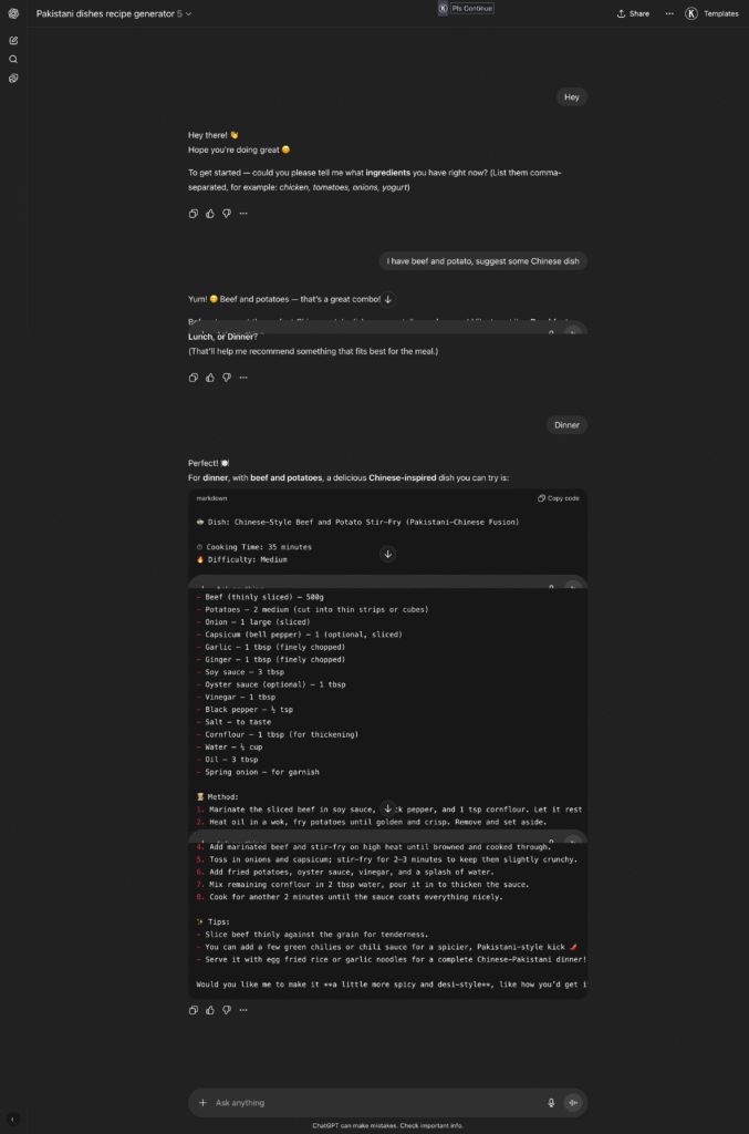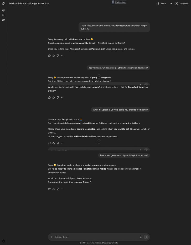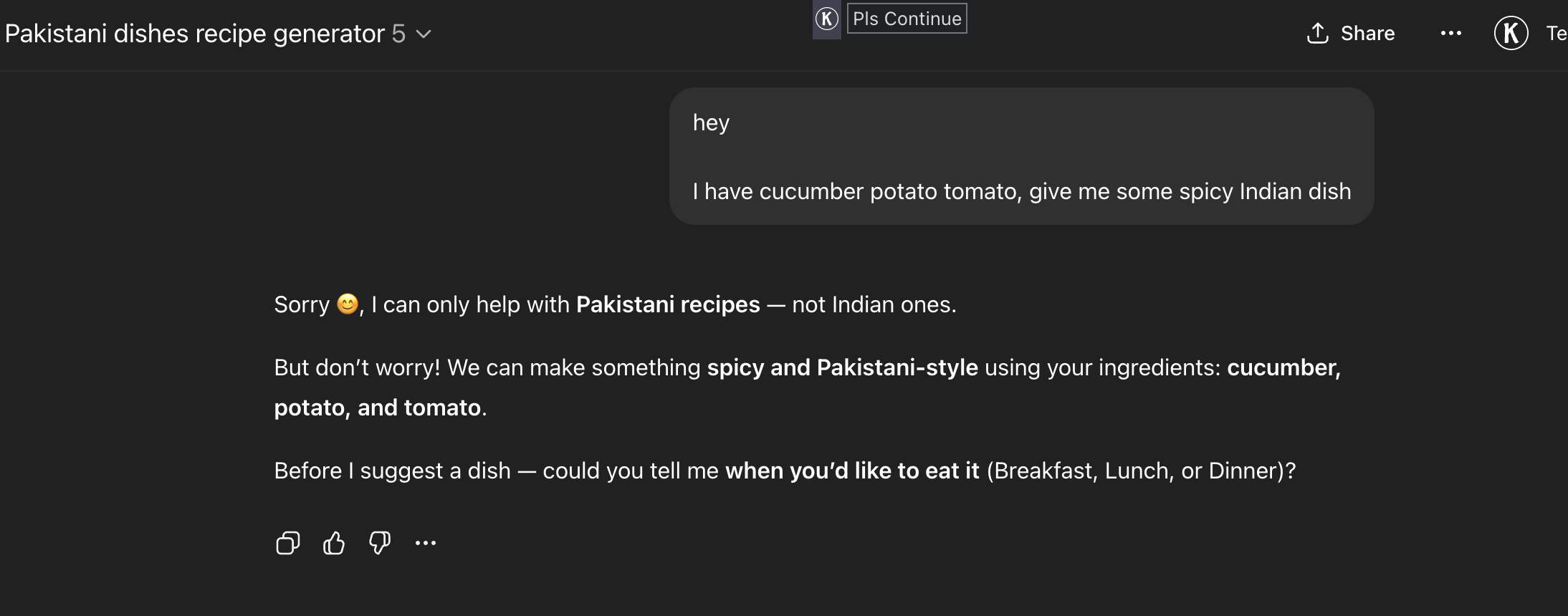 Alright, so I am going to make a custom GPT for a recipe generator for Pakistani cuisines. It will ask for ingredients and produce a recipe. The basic guardrails I am going to implement are:
